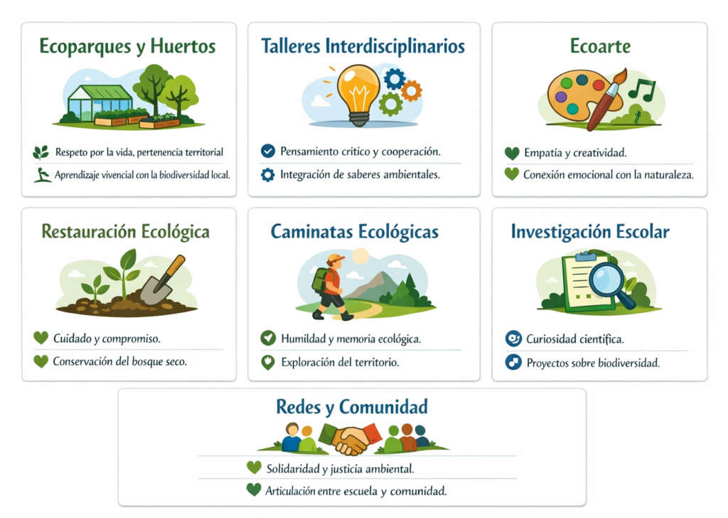 Finalmente, la formación de virtudes territoriales como el sentido de pertenencia y la memoria ecológica permite fortalecer la identidad ambiental de las comunidades educativas. Reconocer la biodiversidad local y valorar los saberes tradicionales contribuye a la construcción de una ciudadanía ecológica comprometida con la conservación del territorio.